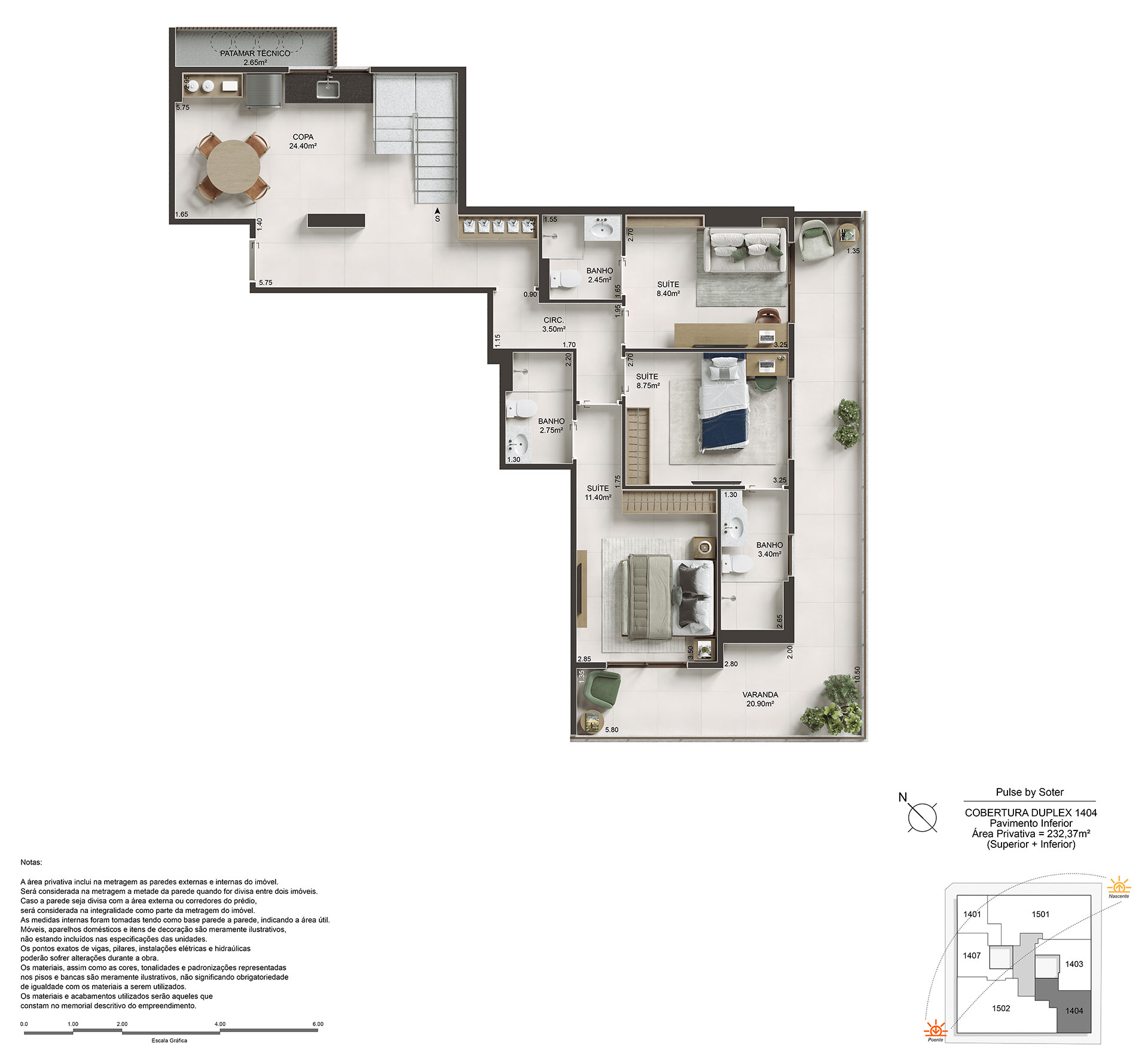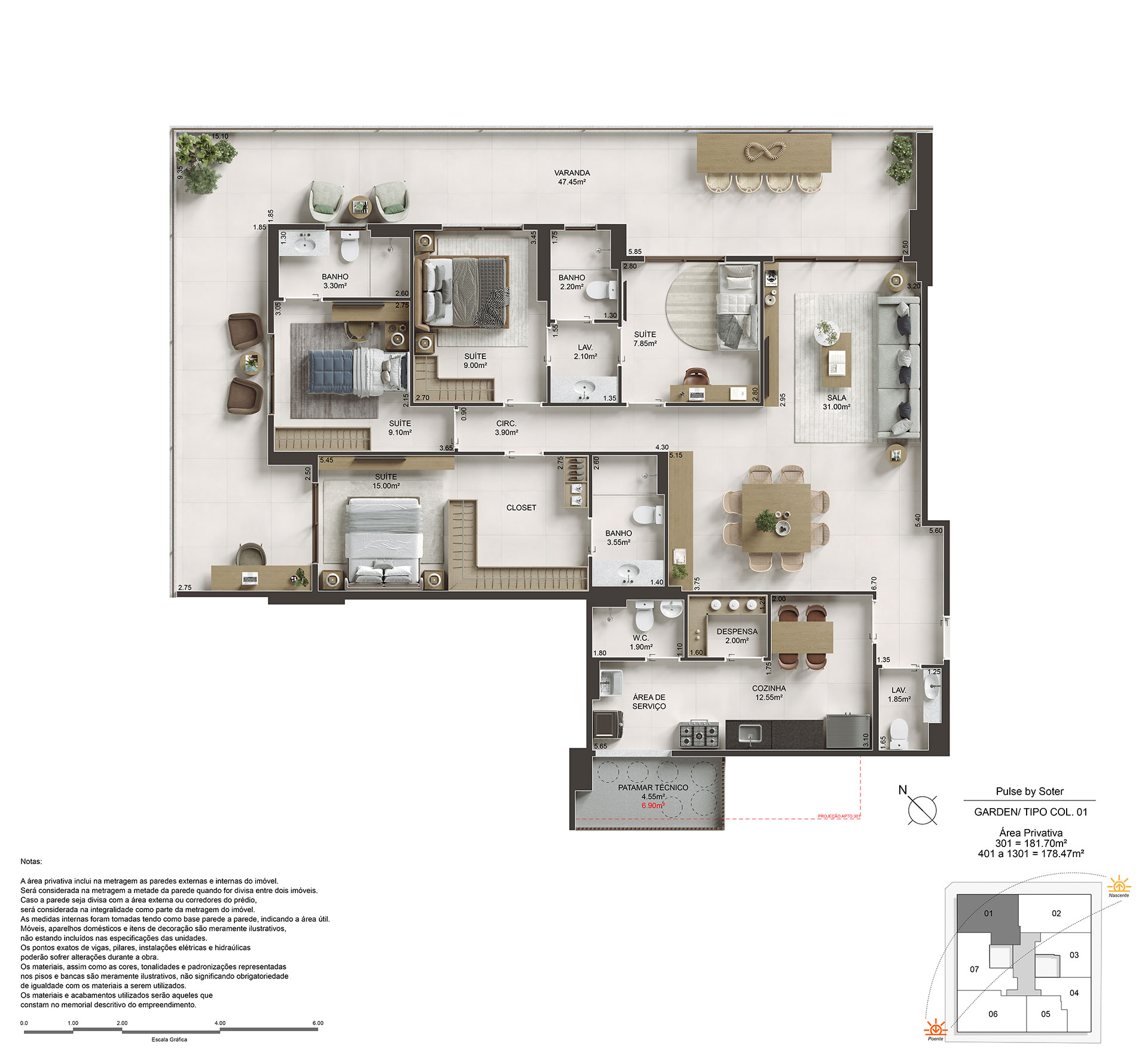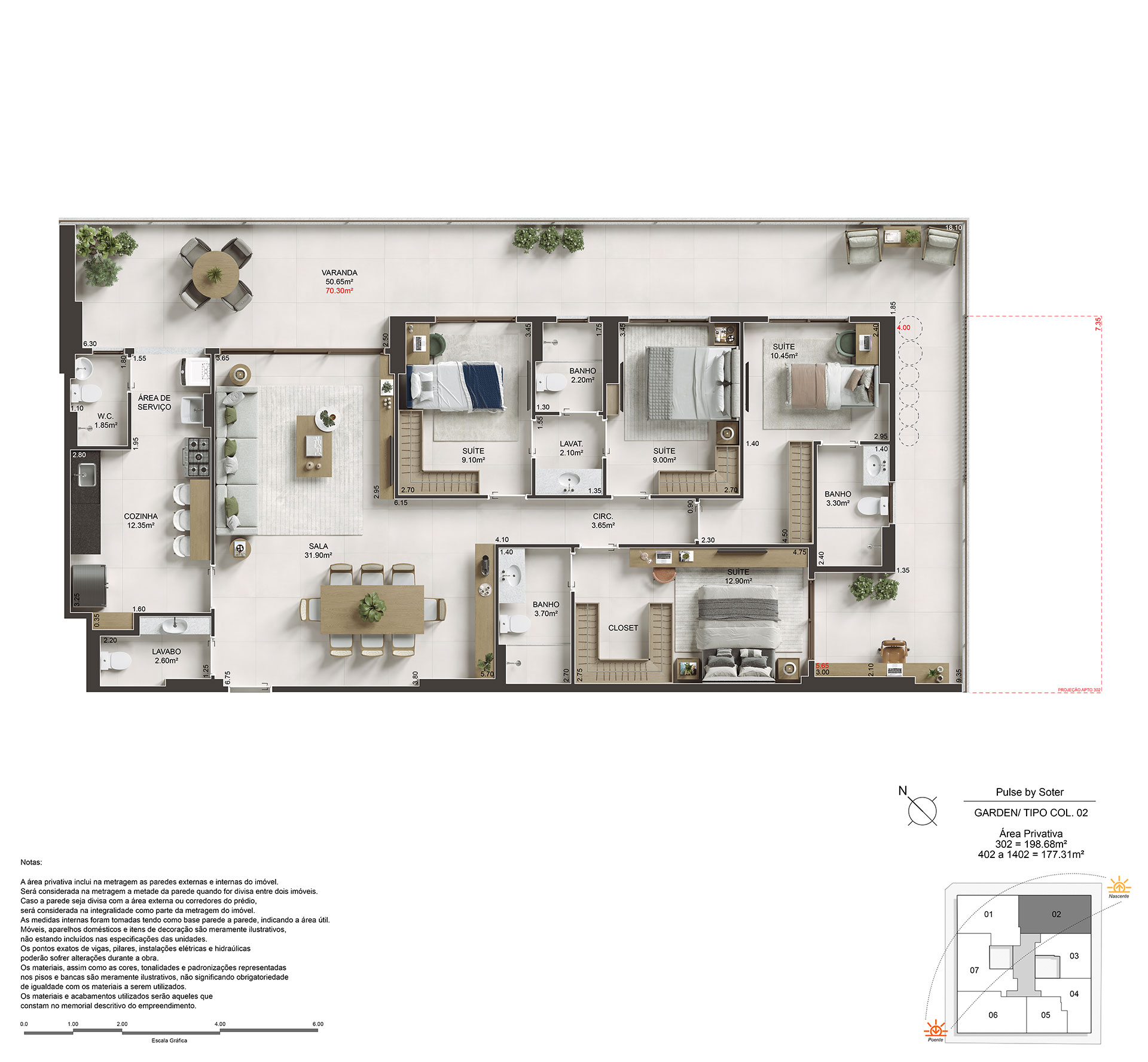 Amplos apartamentos de 89 a 180m² com até 2 vagas de garagem. Cobertura duplex de 232m² com 2 vagas de garagem.